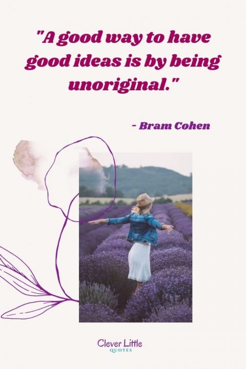 July 8, 2021September 8, 2020 by Clever Quotes “A good way to have good ideas is by being unoriginal.” – Bram Cohen A good way to have good ideas is by being unoriginal. - Bram Cohen Click to Share Pin this Image Pin Help us to share this great article. Your friends will appreciate it! 3shares Facebook0 Twitter0 Pinterest1 LinkedIn1 Flipboard Tumblr1 Mix