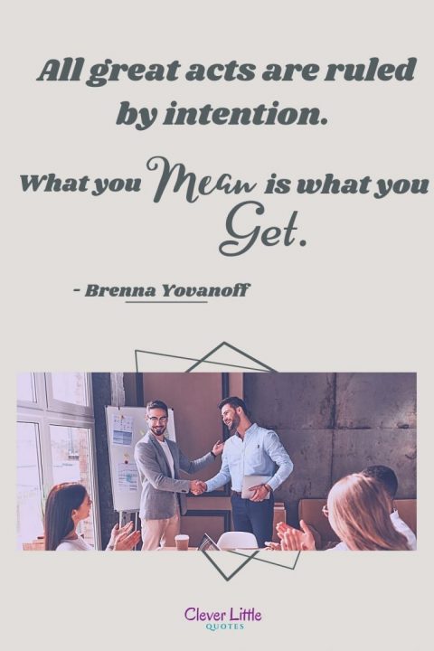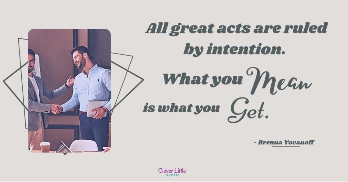 June 30, 2021September 10, 2020 by Clever Quotes “All great acts are ruled by intention. What you mean is what you get.” – Brenna Yovanoff All great acts are ruled by intention. What you mean is what you get. - Brenna Yovanoff Click to Share Pin this Image Pin Help us to share this great article. Your friends will appreciate it! 2shares Facebook0 Twitter0 Pinterest1 LinkedIn1 Flipboard Tumblr0 Mix