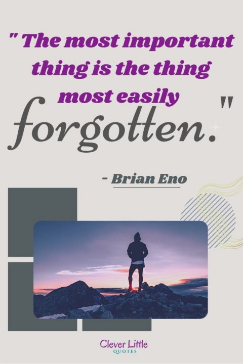 June 11, 2021September 11, 2020 by Clever Quotes “The most important thing is the thing most easily forgotten.” – Brian Eno The most important thing is the thing most easily forgotten - Brian Eno Click to Share Pin this Image Pin Help us to share this great article. Your friends will appreciate it! 3shares Facebook0 Twitter0 Pinterest1 LinkedIn1 Flipboard Tumblr1 Mix